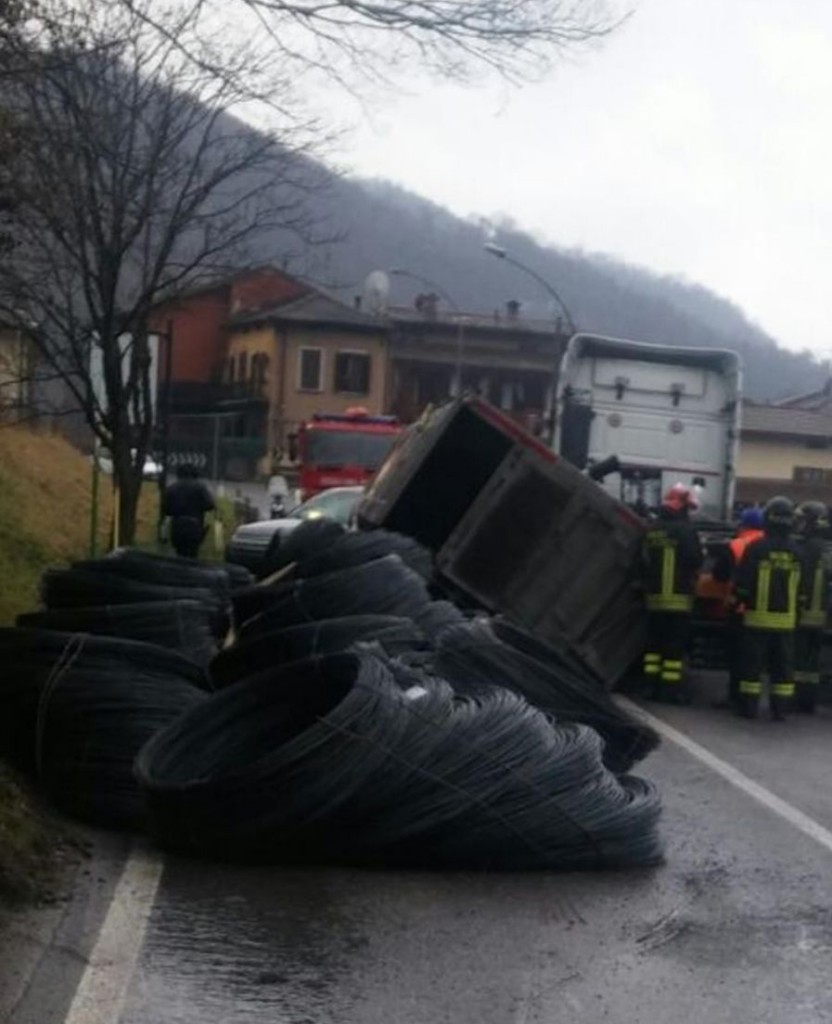 CISANO BERGAMASCO – Si è rischiata la tragedia a Cisano Bergamasco: un camion giovedì mattina si è ribaltato in località Bondì perdendo il proprio carico di vergelle, finite in strada.