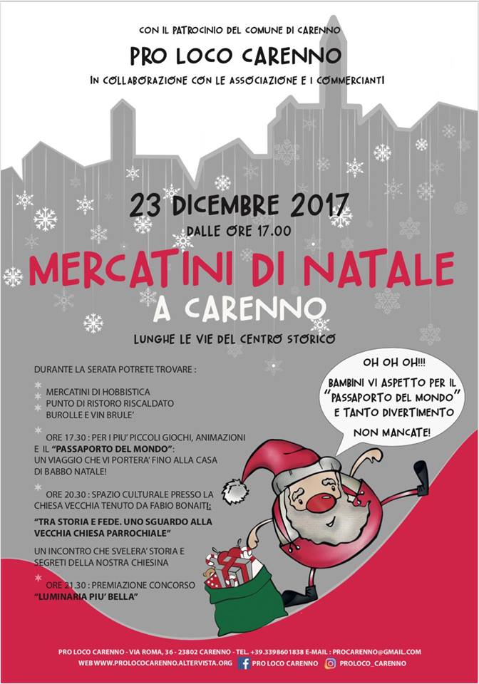 CARENNO – E’ tempo di mercatini natalizi anche a Carenno. Sabato 23 dicembre è in programma la bella iniziativa organizzata dalla Pro Loco in collaborazione con i commercianti e le associazioni.