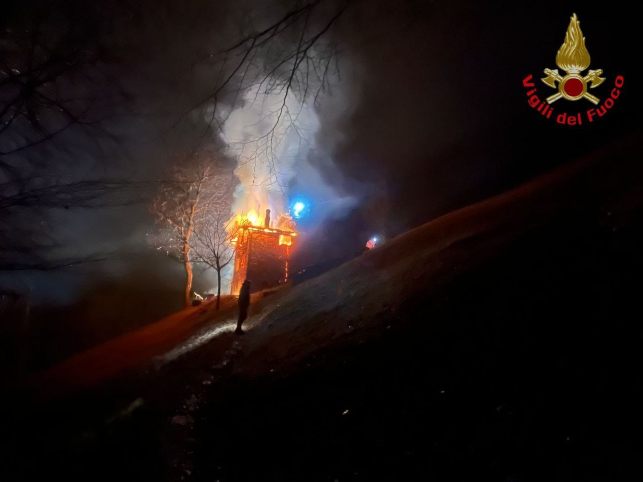 L’allarme è scattato prima delle 20  ma le fiamme avevano già avvolto l’edificio distruggendolo. In questo momento è ancora in corso l’intervento dei pompieri e fortunatamente non risultano persone coinvolte.