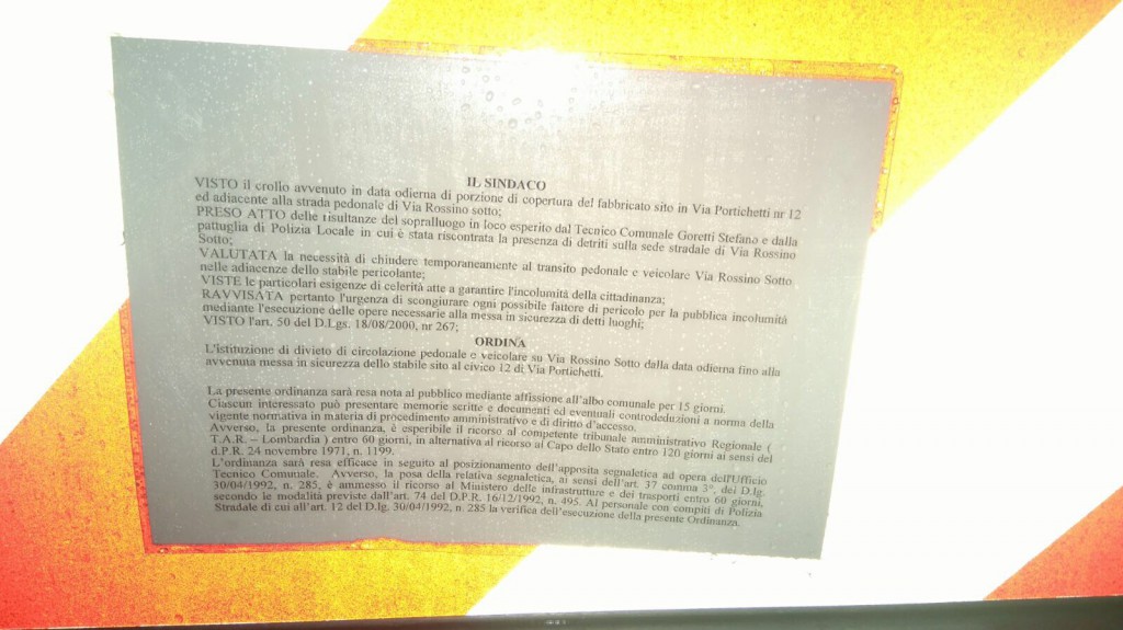 Sempre per motivi di sicurezza il transito pedonale di via Rossino Sotto è stato momentaneamente vietato: le famiglie che abitano la corte dovranno accedervi da una via secondaria.