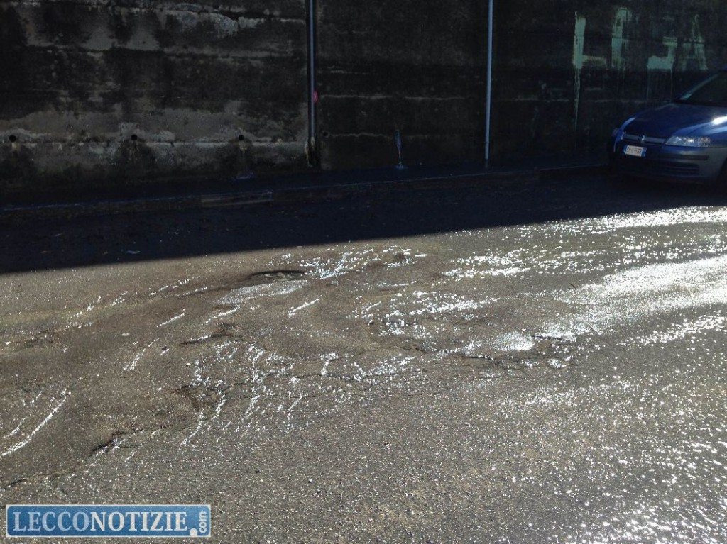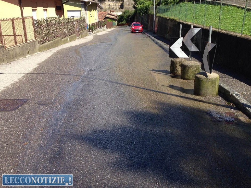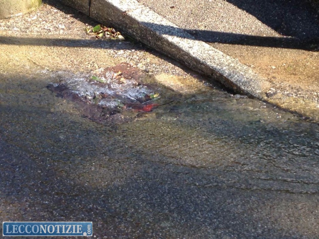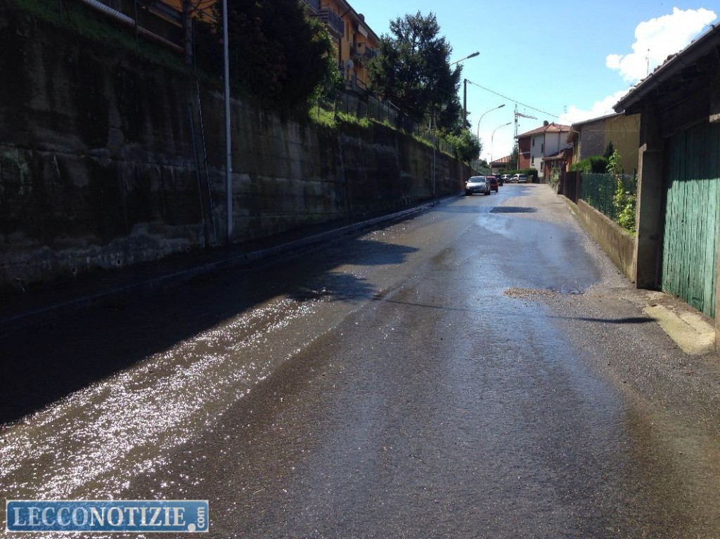 LECCO –  Le giornate difficili con le inusuali piogge torrenziali sembrerebbero passate, almeno per ora, ma nel rione di Chiuso c’è un fiume d’acqua che non accenna a smettere, e copre buona parte della carreggiata di via Mulini.
