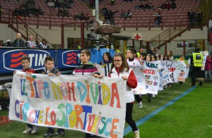 Arrivati a destinazione, alle ore 18.00 scatterà l’iniziativa Stendi la violenza, abbracciamo lo stadio: ragazzi e genitori proveranno ad “abbracciare” lo stadio con lo striscione più lungo d’Europa (1.700 metri), realizzato con tutti i disegni che i ragazzi hanno creato lo scorso anno sul tema sport e pace.