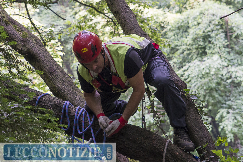 Con tecniche SAF (soccorso Speleo Alpino Fluviale), un pompiere si è arrampicato sull’albero riuscendo a raggiungere il micio e a riportarlo a terra.