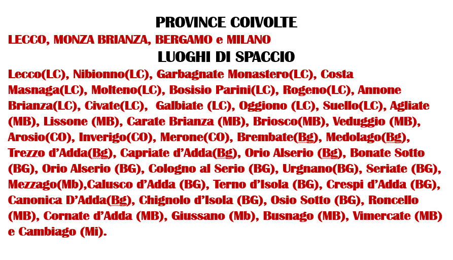 Attraverso numerosi appostamenti, pedinamenti e attività tecniche, gli agenti della Squadra Mobile sono riusciti ad individuare un gruppo di spacciatori stanziati prevalentemente nel bergamasco ma che estendevano la propria attività criminosa fino al lecchese. Sotto la direzione del sostituto procuratore di Bergamo, dott.ssa Santoro, l’antidroga di Lecco ha fatto luce su quella che viene giudicata come “un’intensa rete di spaccio”.