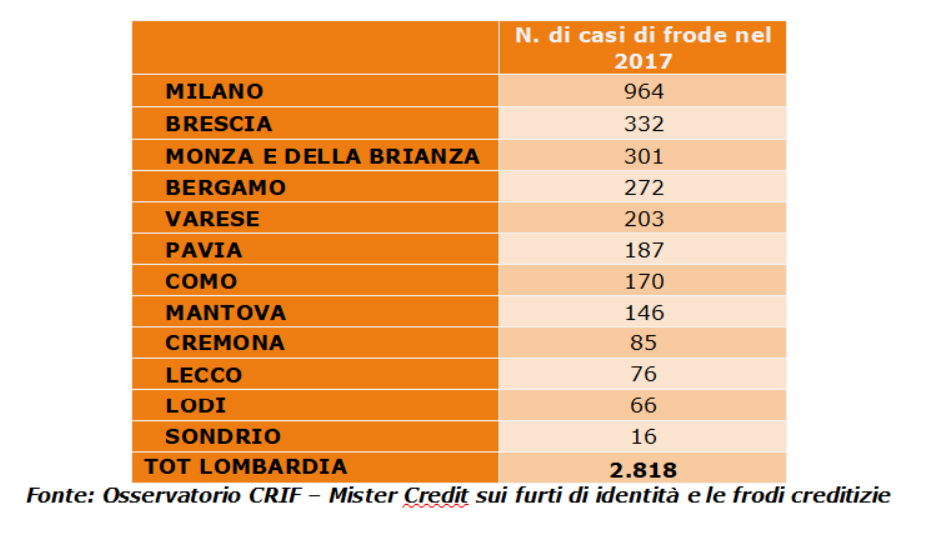 Tra le province lombarde il maggior numero di frodi è stato registrato in quella di Milano, con 964 casi (che collocano il capoluogo meneghino al 4° posto nel ranking nazionale). Seguono le province di Brescia, con 332 casi, e Monza e Brianza, con 301 casi.