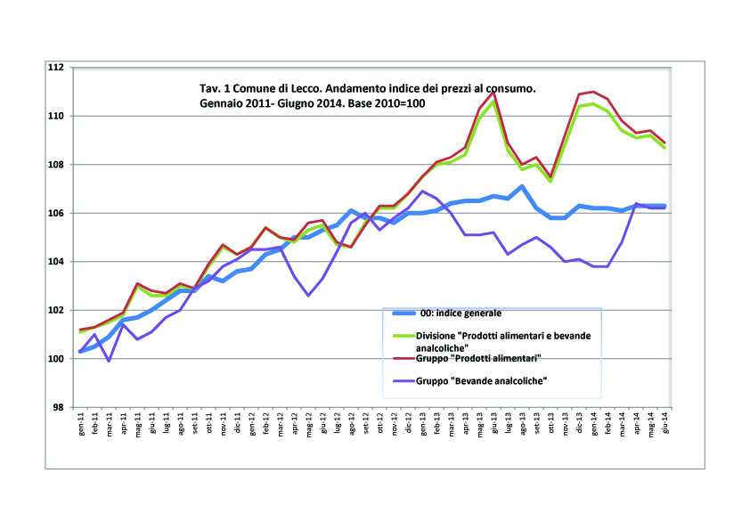 L’ultimo dato disponibile è quello di giugno 2014: l’indice di Lecco si attesta a 108,7 (tav. 1) e pertanto l’aumento registrato in 3 anni e mezzo è di quasi 9 punti, mezzo punto in meno di quello lombardo ma superiore di circa un punto a quello medio nazionale (rispettivamente 109,4 e 108). L’indice di Lecco si colloca alla seconda posizione nella graduatoria crescente (è di Pavia l’indice più basso registrato 106,1 e di Varese quello più alto 110,9, immediatamente preceduto da Lodi che registra un valore inferiore di un decimo di punto). L’indice dei prezzi generale, invece, quello medio di tutte le dodici divisioni di spesa, si attesta a quota 106,3, pertanto a un valore inferiore di quasi 2 punti e mezzo rispetto a quello della divisione alimentari; mediamente i due indici sono cresciuti rispettivamente dell’1,8% e del 2,5% all’anno.