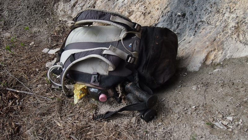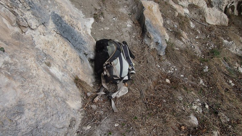 Lo zaino è apparso da subito sporco su un fianco e dalla tasca laterale semiaperta si notava una bottiglia d’acqua; all’interno invece un telefono cellulare Motorola, una torcia tascabile, un paio di bastoncini da trekking, una bottiglia d’acqua da 1,5 litri e una giacca a vento. Niente portafogli, ma qualche foglietto nella tasca superiore illeggibile, evidentemente sgualcito dall’acqua. Le condizioni dello zaino stesso erano tali da far pensare che fosse lì da diversi giorni. I due escursionisti hanno effettuato in sicurezza una ricognizione in zona per quanto lo consentiva il terreno impervio, ma non hanno notato nient’altro di strano né rinvenuto tracce di passaggi o altro di anomalo.