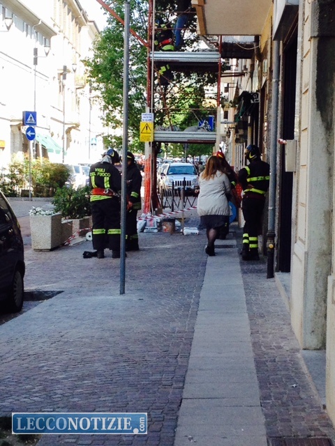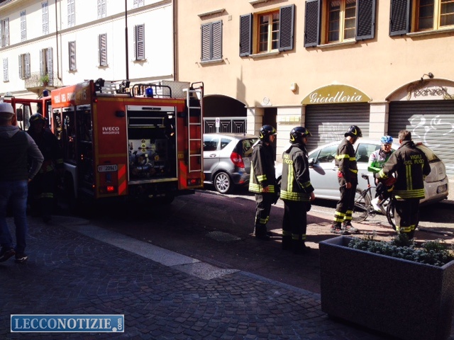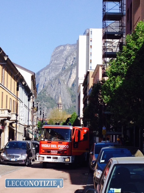 LECCO – Vigili del Fuoco in azione in Via Azzone Visconti a causa di un principio di incendio durante i lavori di rifacimento della copertura del tetto di un’abitazione, nelle vicinanze del Caffè Merida.