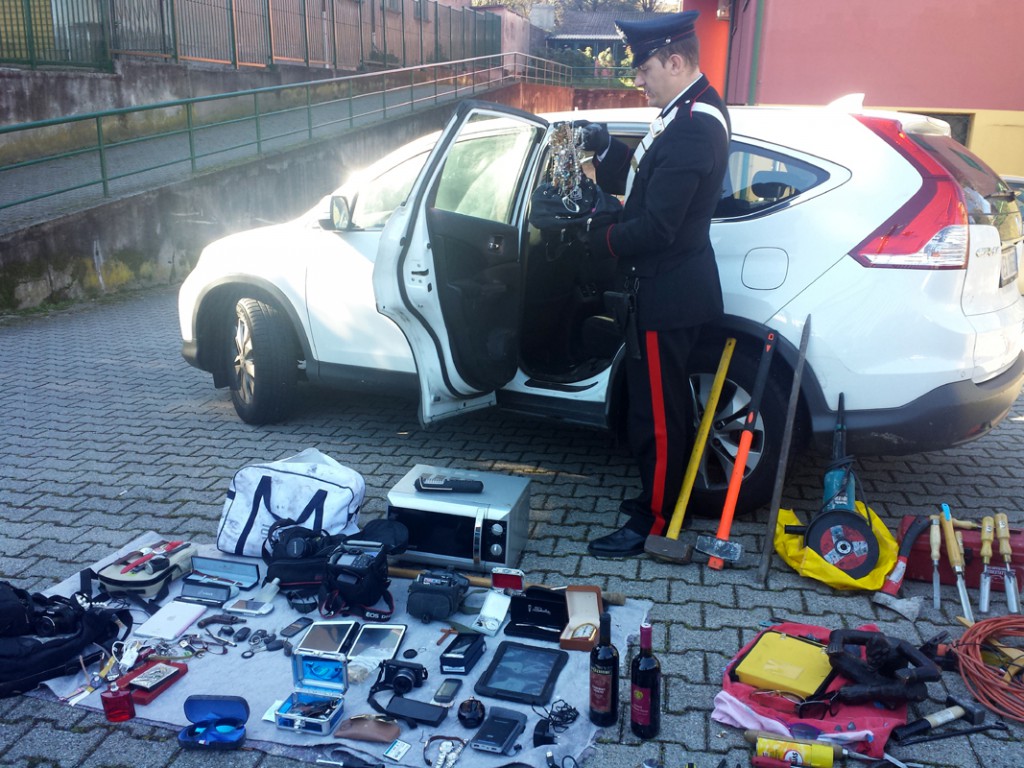 A seguito di ispezione del veicolo i carabinieri hanno recuperato e sequestrato attrezzatura atta allo scasso, tra cui mazze ferrate, piedi di porco e cacciaviti di grosse dimensioni, nonché piccoli elettrodomestici, macchine fotografiche, computer portatili e bigiotteria, sicuro provento di furti in abitazione, sui quali sono stati avviati mirati accertamenti per risalire ai legittimi proprietari.
