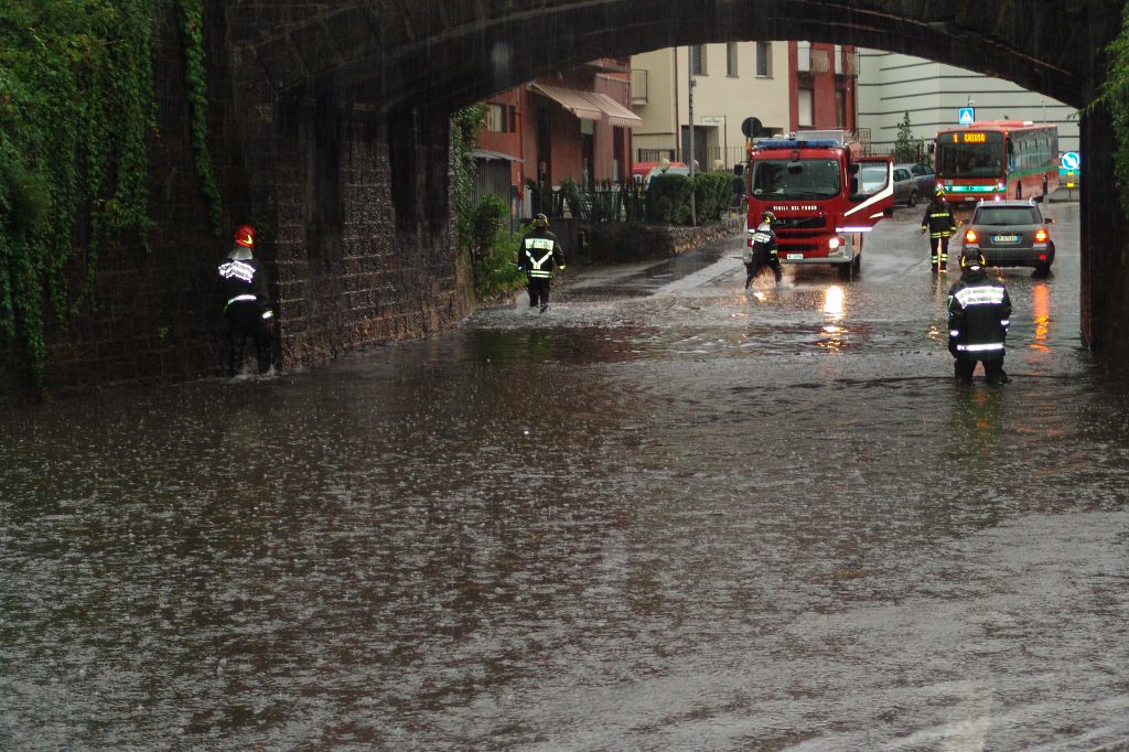 LECCO – Un temporale di fortissima intensità si è abbattuto sulla città di Lecco poco dopo le 14 causando grossi disagi alla viabilità. Chiuso Corso Carlo Alberto dove la strada si è allagata in prossimità del ponte della ferrovia dove due auto sono rimaste bloccate. Sul posto è intervenuta la Polizia Locale e i Vigili del Fuoco che hanno dovuto spingere fuori dall’enorme pozza alta più di un metro i due mezzi bloccati.