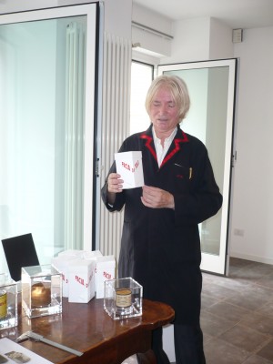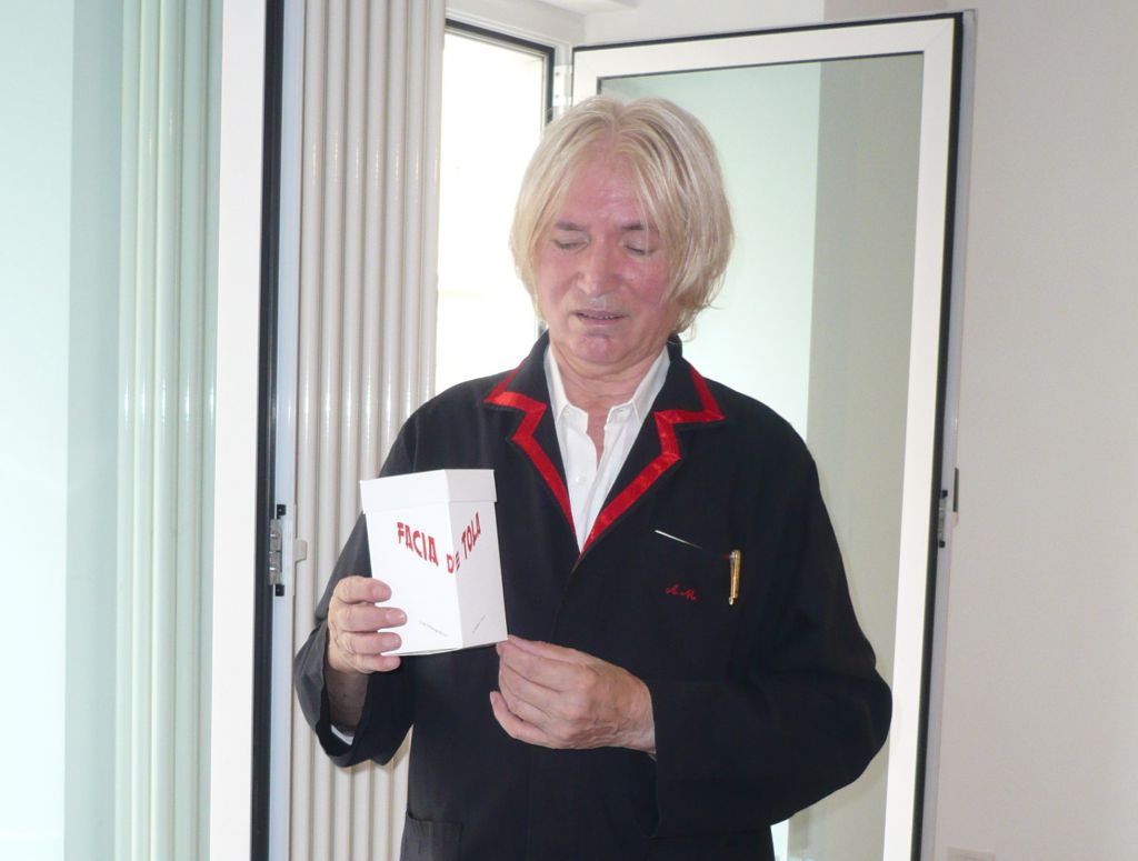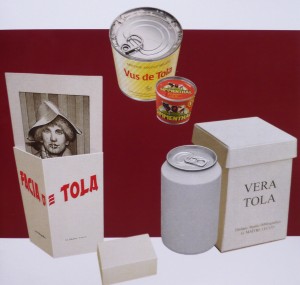 Vera Tola è, invece, un esemplare sigillato vuoto. Dato che nelle scatole è stato messo di tutto (come anche la “Merda d’artista” di Piero Manzoni insegna), io ho voluto vanificare questo esemplare”. Una latta senza scritte, inserita in una scatola e affiancata “da un bugiardino esplicativo, come per le medicine”. Ecco la natura di Vera Tola, cui si affianca, infine, la Facia de Tola, ultima creazione di Milani. Una scatola dalla base romboidale, all’interno della quale si trova, per l’appunto, una “facia de tola”: il volto giovanile dell’autore dell’opera, stampato su cartoncino grazie a un’incisione. “Ero ragazzo – ha spiegato – quando mi divertivo nell’indossare abiti strani e nel fotografarmi in una delle macchinette della stazione. Ne sono uscite delle immagini originali e oggi ne ho scelta una adatta per l’opera. All’interno della scatola di cartone, insieme al mio volto, anche l’immancabile scatola di tola”.