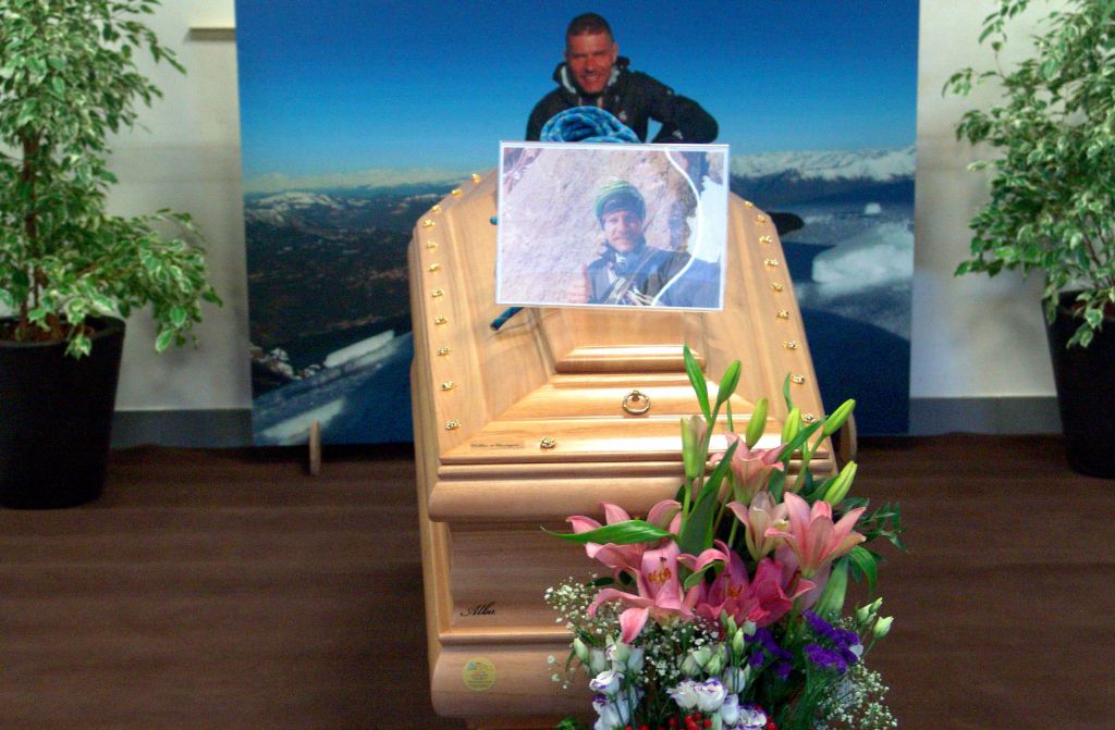 Al centro della sala, il feretro di Marco sopra il quale è stata adagiata una corda da scalata, dietro uno dei bellissimi autoscatti realizzati dall’alpinista; una foto che lo ritrae felice sulla sua Grignetta e che risale all’8 marzo scorso. “Anche il sole da il suo buongiorno” scriveva Marco su Facebook titolando questo scatto.