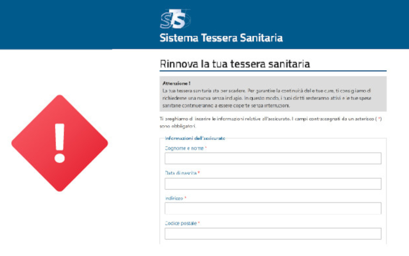 Le e-mail fraudolente invitano l’utente a cliccare su un link per procedere al presunto rinnovo della tessera sanitaria. Il link rimanda a un sito web falso, graficamente simile alle piattaforme istituzionali, all’interno del quale viene richiesto di compilare un modulo con numerosi dati personali e sensibili. I dati raccolti possono essere utilizzati per scopi illeciti, come la rivendita delle informazioni, la clonazione di documenti o altre attività fraudolente.