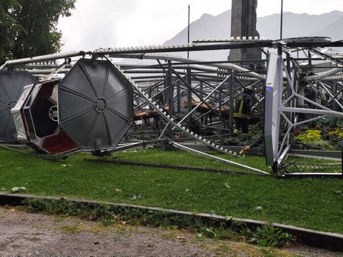 LECCO – La ruota panoramica ‘lascia’ il lungolago. Da ieri mattina, mercoledì, gli operai sono al lavoro per la rimozione dei resti dell’attrazione, crollata al suolo dopo la violenta ondata di maltempo che aveva colpito il territorio lo scorso 21 giugno (leggi qui). Nessun ferito, fortunatamente, ma solo danni e i ‘resti’ della ruota a terra in Riva Martiri delle Foibe, davanti al Monumento dei Caduti.