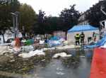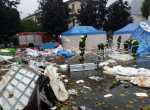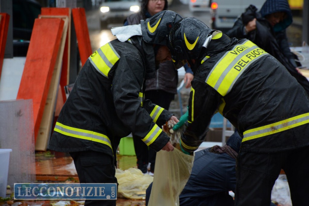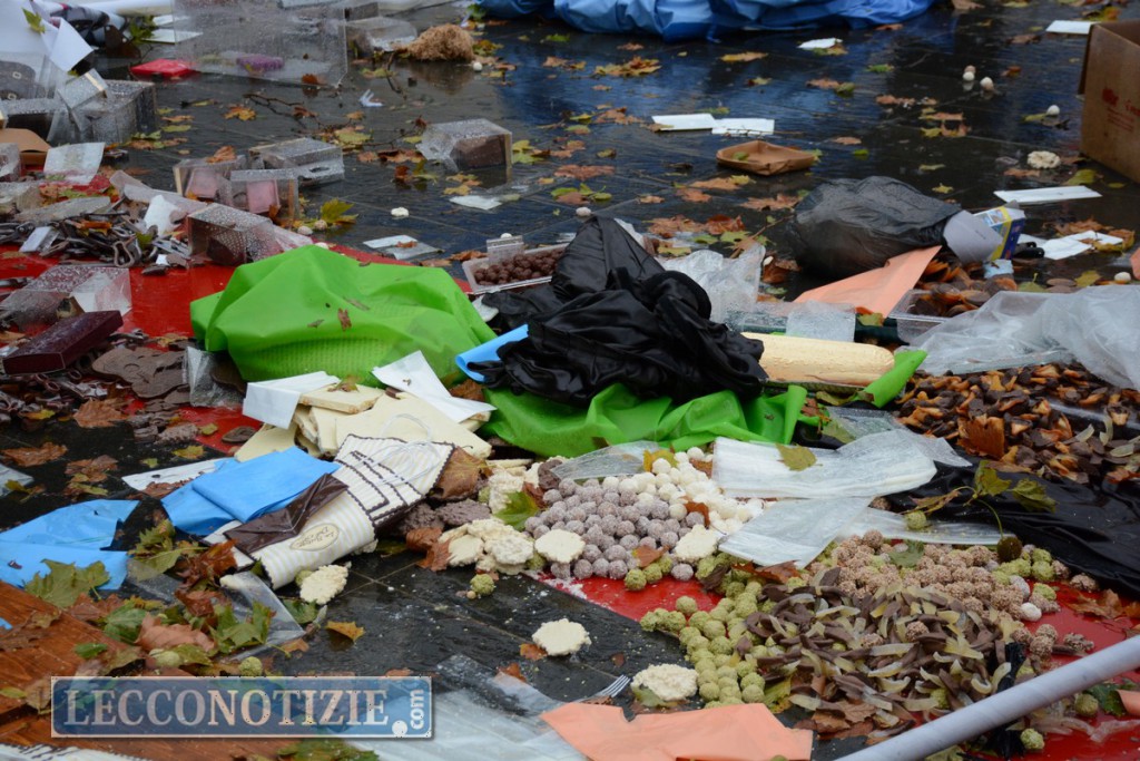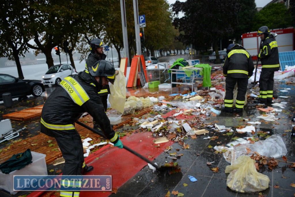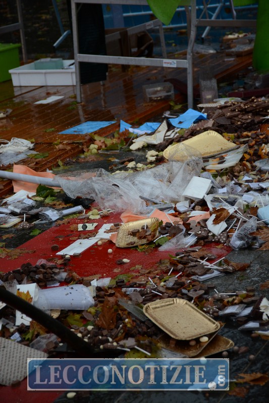 In Piazza Cermenati dove il nubifragio ha devastato alcuni degli stand allestiti per la Festa del Cioccolato