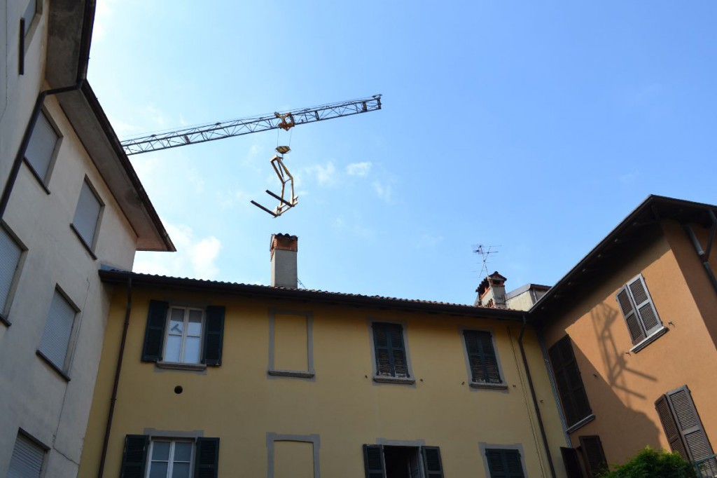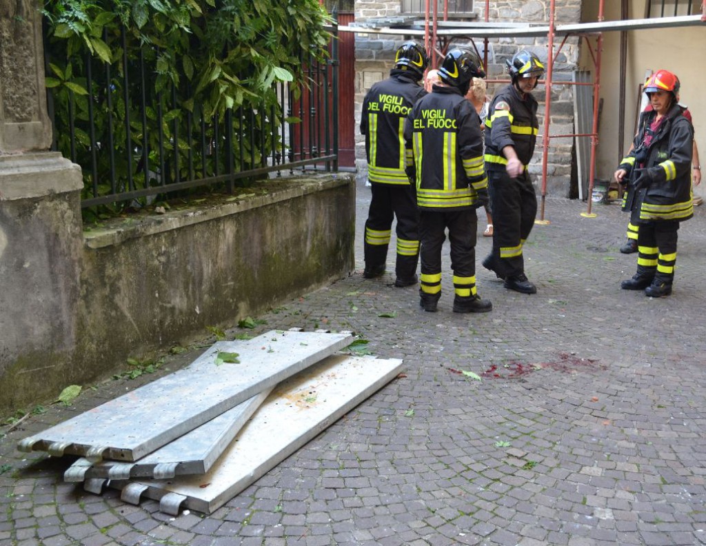 E’ accaduto intorno alle 15.30. Dal carrello della gru azionata dagli addetti al cantiere in fase di installazione all’esterno di un’abitazione privata, dopo che la stessa aveva urtato un grosso comignolo di un edificio confinante, si sono staccate e sono cadute sulla strada sottostante alcune grosse pedane in lamiera.