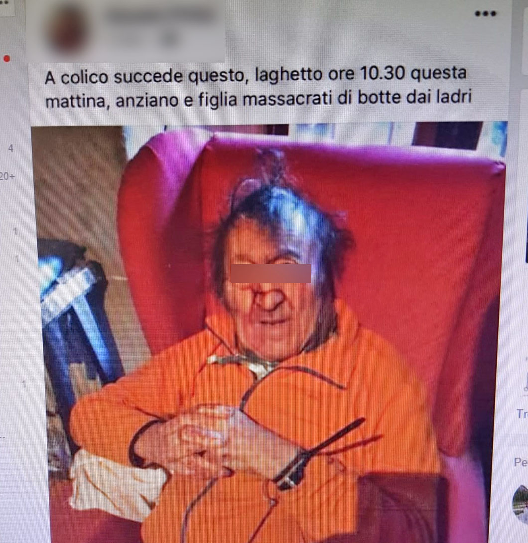 Il volto dell’anziano sanguinante per le percosse subite. La foto è stata diffusa sui social