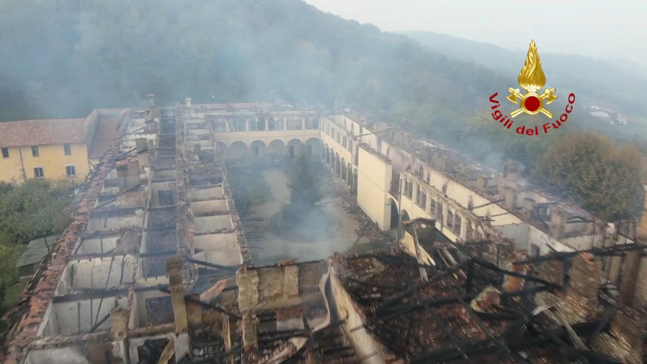 LA VALLETTA BRIANZA – Del Monastero edificato nel ‘600 hanno retto i muri secolari portanti, il colonnato del chiostro, il campanile di mattoni impilati della chiesa di San Gregorio in mezzo ai tanti comignoli spezzati. Del tetto, invece, restano solo frammenti di scheletro: cumuli di cocci di tegole, travi carbonizzate a lasciare scoperta la pianta del complesso. Dall’intera struttura – sabato sera immersa in un arancio incandescente per le fiamme ora si alzano nuvole di fumo.