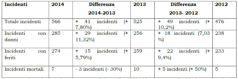 Qui sotto, la tabella fornita dalla Polizia Stradale di Lecco. Dai dati sotto riportati emerge come il “trend” dell’incidentalità, negli ultimi 2 anni, sia in costante aumento, già dall’anno 2012 al 2013 con un tasso percentuale di un + 10,2%, per l’anno 2014 rispetto al 2013 un aumento del 7,80%.