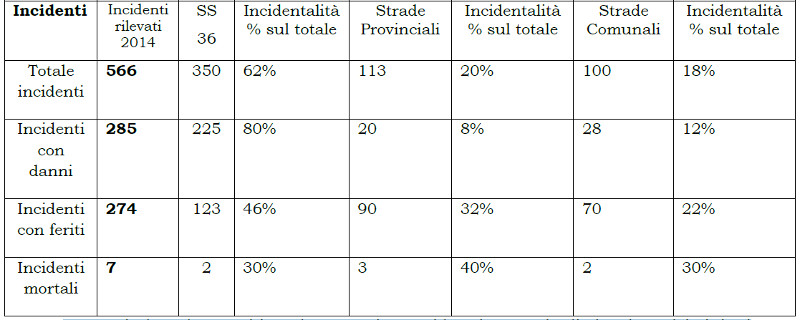 Come già accennato, la SS36 occupa dai dati registrati, un luogo particolarmente rilevante, rappresentando quasi il 62% degli incidenti stradali rilevati, infatti sul numero totale di 566 incidenti rilevati, 350 si sono verificati sulla SS36.