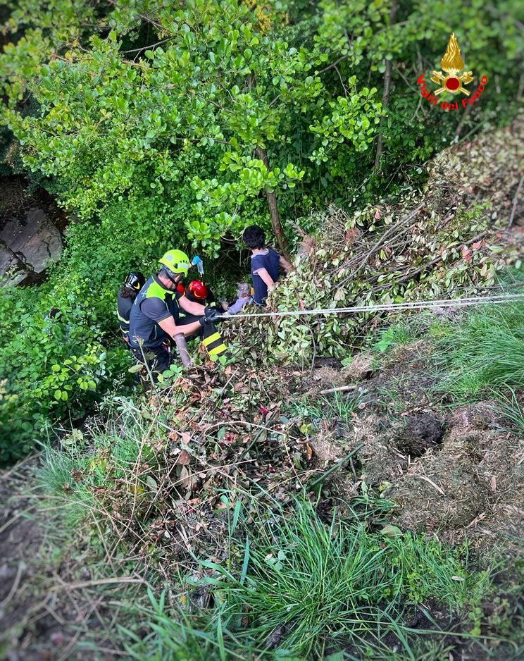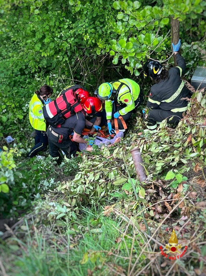 Le operazione di recupero dell'anziano signore caduto con la motocariola