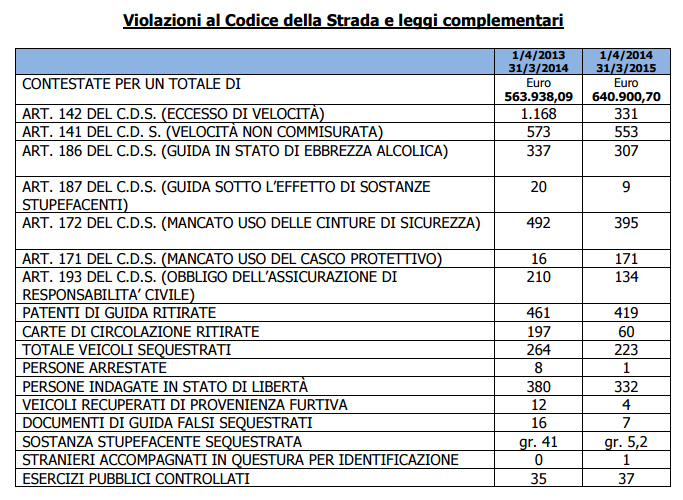 LECCO – Ammontano ad oltre 640 mila euro la sanzioni per le violazioni al codice della strada elevate dalla Polizia Stradale di Lecco in un anno, dall’aprile 2014 al marzo di quest’anno, e sono aumentate rispetto allo stesso periodo dell’anno precedente (aprile 2013-marzo2014) quando invece le multe sfioravano un importo complessivo di 564 mila euro.