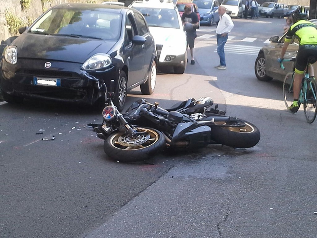 Lo schianto è avvenuto in corso San Michele del Carso, intorno alle 16.40. Soccorso il motociclista, un uomo di 33 anni, caricato in ambulanza dal personale della Croce San Nicolò e trasportato in ospedale con lievi traumi.