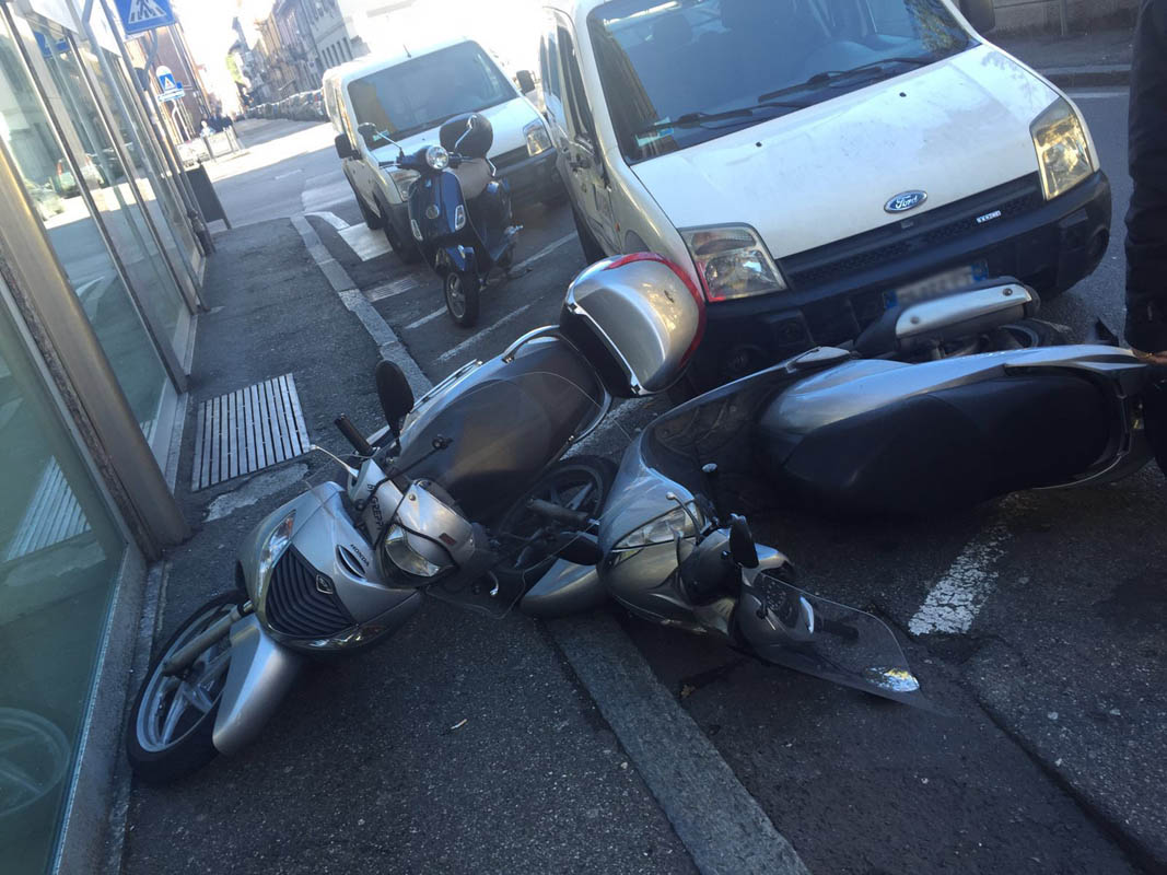 LECCO – Incidente senza feriti in centro Lecco ma con qualche danno, ai mezzi coinvolti ed anche ad alcune moto posteggiate a lato della strada.