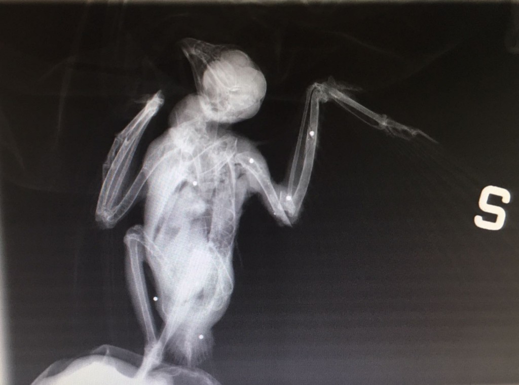 Il rapace è stato rinvenuto da una famiglia che si trovava a passeggiare in zona ed è stato portato da una veterinaria che ha prestato il primo soccorso al povero volatile ed effettuato una radiografia: dalle lastre è stato possibile verificare la presenza di due pallini che hanno causato al falco una brutta frattura dell’omero sinistro ed una frattura dell’ulna sinistra .