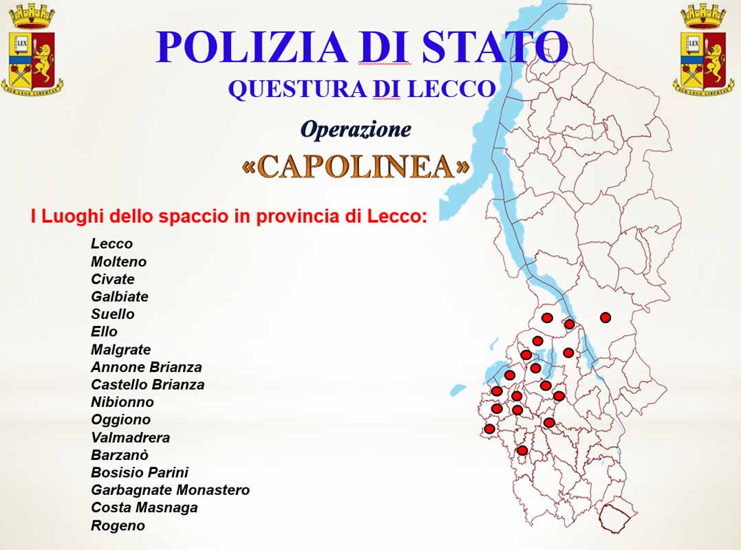 Ancora una volta il giro di spaccio ha riguardato diversi Comuni della provincia ( Annone Brianza, Lecco, Barzanò, Molteno, Nibionno, Suello, Civate, Galbiate, Garbagnate Monastero, Castello Brianza). A Pescarenico è stato fermato un 42enne marocchino, secondo gli agenti era il pusher che vendeva droga all’interno del parco di Villa Gomes a Maggianico,  spacciandola anche ai ragazzini che ‘bigiavano’ la scuola.