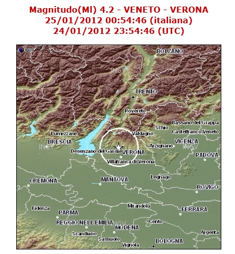 Un terremoto di magnitudo (Ml) 4.2 è avvenuto poco prima dell’una di questa notte per la precisione alle 00:54:46 italiane come riportato sul sito dell’Istituto Nazionale di Geofisica e di Vulcanologia di Roma. Il terremoto è stato rilevato nelle Prealpi venete con l’epicentro localizzato a circa 11 chilometri a Nord della città di Verona.
