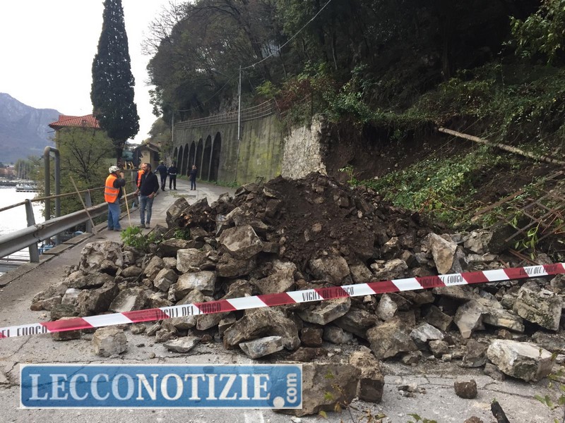 Le piogge abbondanti degli ultimi giorni stanno facendo sentire i loro effetti: dopo gli smottamenti lungo la Sp 72 tra Varenna e Bellano che hanno portato alla chiusura della strada, un nuovo distaccamento è avvenuto a Valmadrera dove i massi hanno sepolto un’auto parcheggiata lungo la strada che costeggia il lago, nei pressi dall’Hotel Terrazzo.