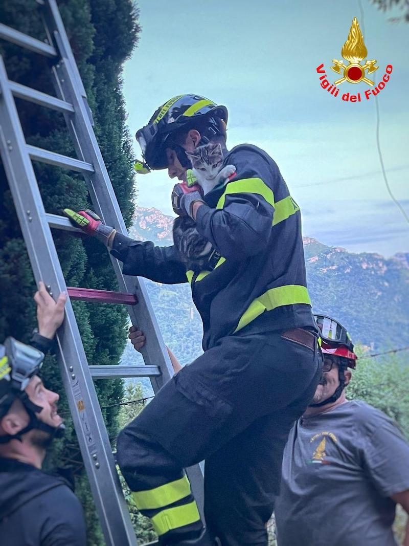 BALLABIO – Vigili del fuoco intervenuti ieri sera, martedì, a Ballabio Superiore, per recuperate una gattina di nome Mel finita in cima ad cipresso a circa 8 metri di altezza.