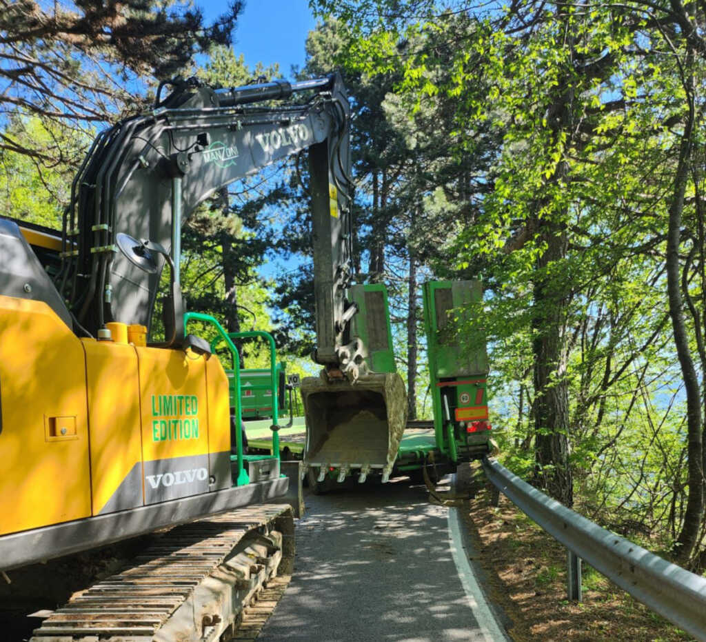 ORE 10.30 – L’autista del mezzo pesante, dopo aver scaricato l’escavatore, lo ha utilizzato per distrincare il camion, consentendo al traffico bloccato di defluire e quindi riprendere la strada verso i resinelli .