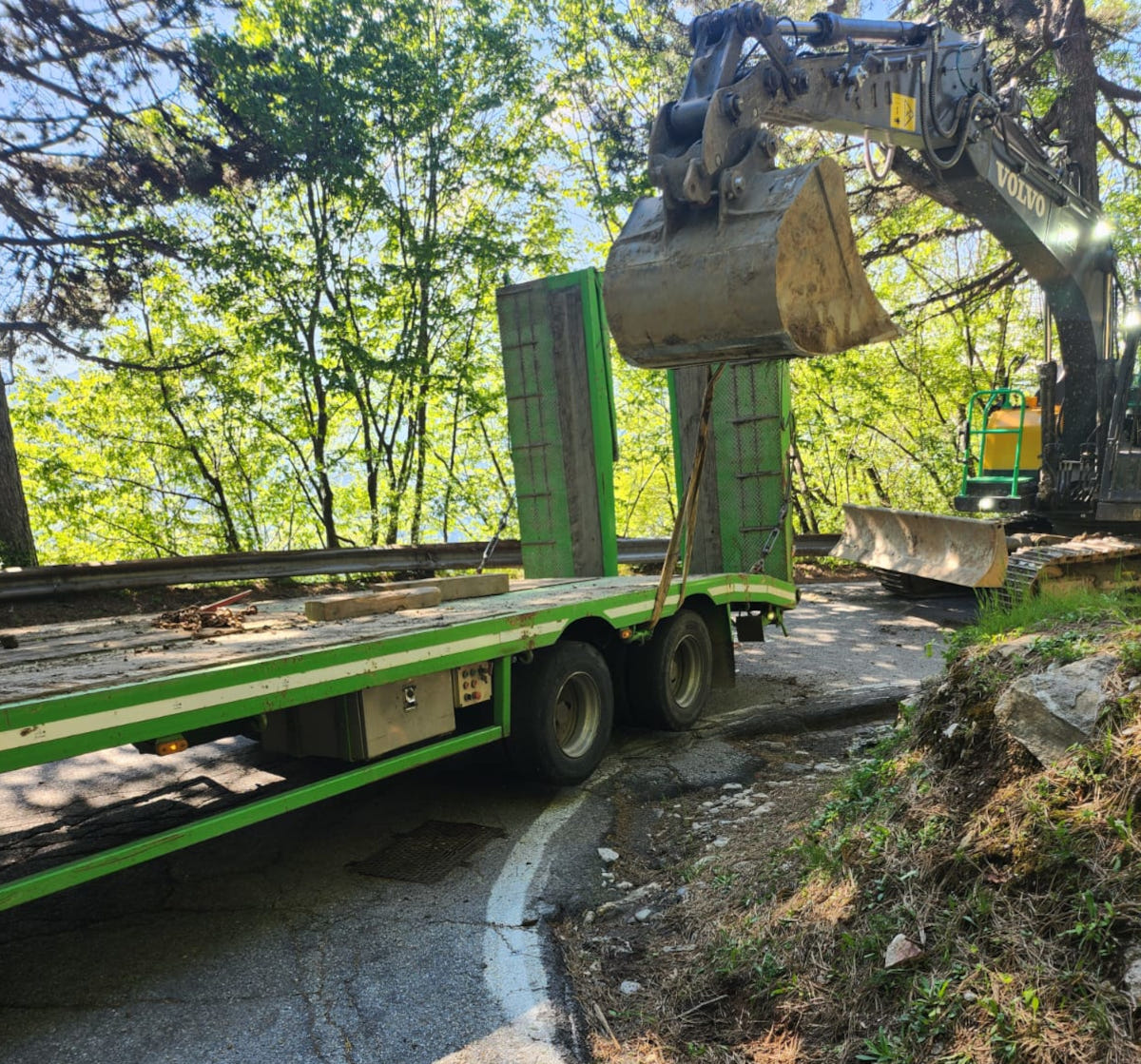 ORE 10.30 – L’autista del mezzo pesante, dopo aver scaricato l’escavatore, lo ha utilizzato per distrincare il camion, consentendo al traffico bloccato di defluire e quindi riprendere la strada verso i resinelli .