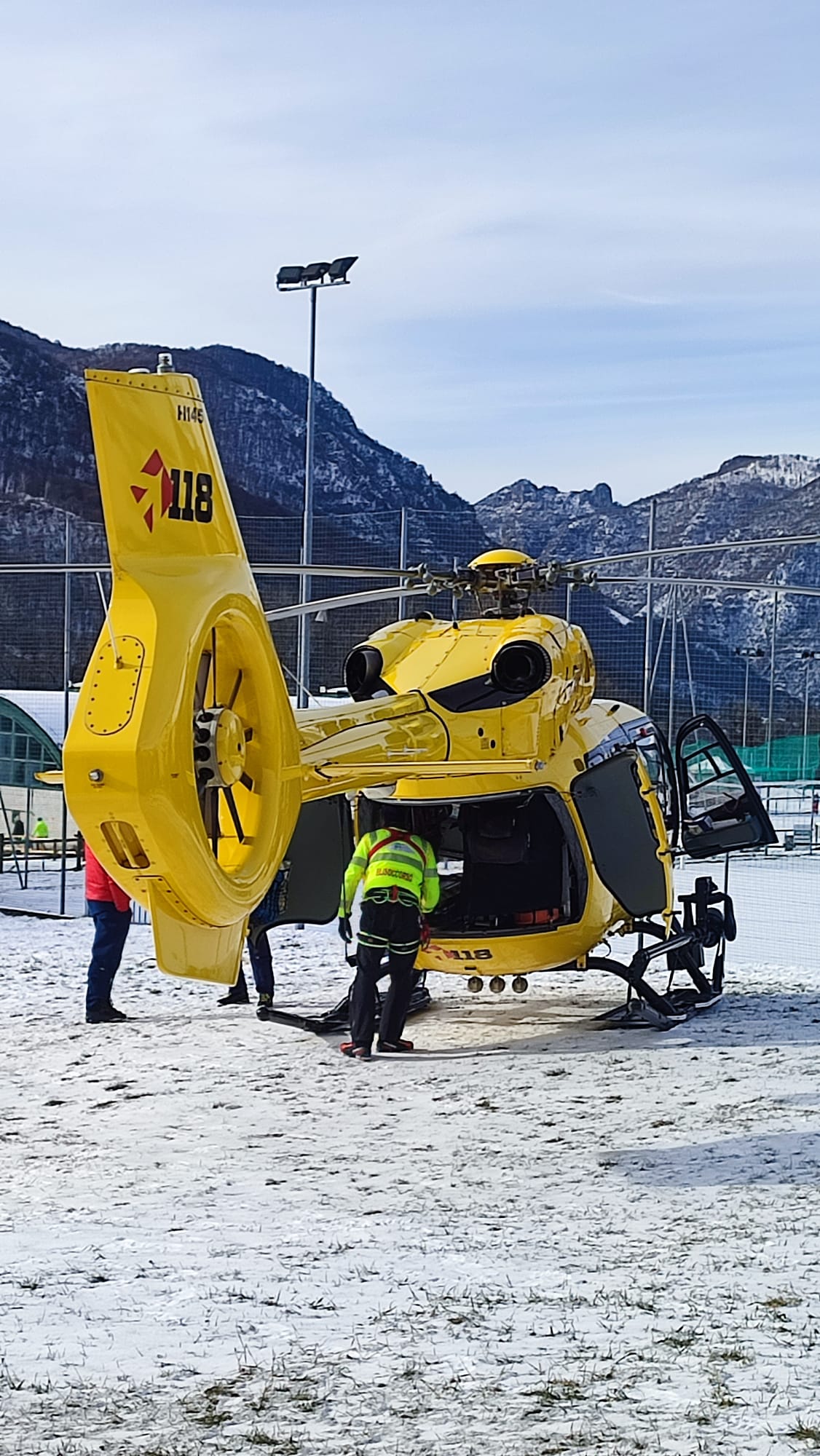 L'infortunato viene caricato dai volontari del Soccorso Alpino della Stazione Valsassina - Valvarrone sull'elisoccorso di Bergamo atterrato al campo di calcio