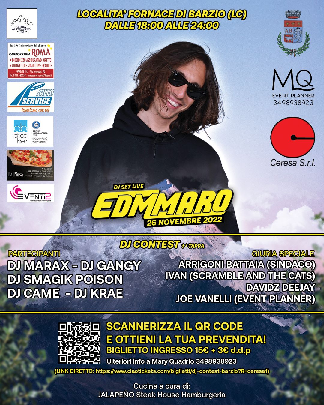 Vendita biglietti on line https://www.ciaotickets.com/biglietti/dj-contest-barzio?R=ceresa1 e in loco a 15,00€, ulteriori info al numero 3498938923 (Mary Quadrio).
