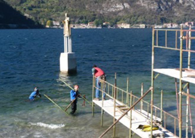 I lavori di realizzazione del pontile e della struttura in ferro sono coordinati dall’impresa Chisotti e dai volontari di Appello per Lecco, con il supporto indispensabile dei subacquei dell’associazione salvamento di Lecco.