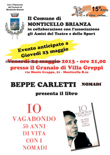 L’appuntamento, organizzato e promosso dal Comune di Monticello Brianza in collaborazione con l’Associazione gli Amici del Teatro e dello Sport, si inserisce nel lungo tour di presentazione che Beppe Carletti sta portando avanti da febbraio in molte città italiane. L’autore del libro “Io vagabondo. 50 anni di vita con i Nomadi” altri non è che uno dei fondatori storici del gruppo dei Nomadi, nati a Novellara, nella bassa reggiana, nel 1963 e che proprio quest’anno festeggiano i primi cinquant’anni di carriera.