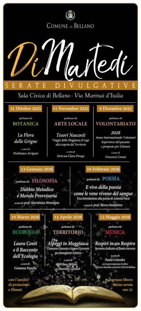 BELLANO – Riparte a Bellano la rassegna “DiMartedì”, il ciclo di incontri culturali che anima il borgo da ottobre a maggio con un appuntamento al mese. Dalla botanica alla filosofia, dall’arte locale alla musica, fino ai temi ambientali e sociali, anche quest’edizione promette un viaggio ricco di saperi, esperienze e curiosità. Gli incontri si terranno nella Sala Civica di Via Marinai d’Italia, alle ore 21 con ingresso libero.