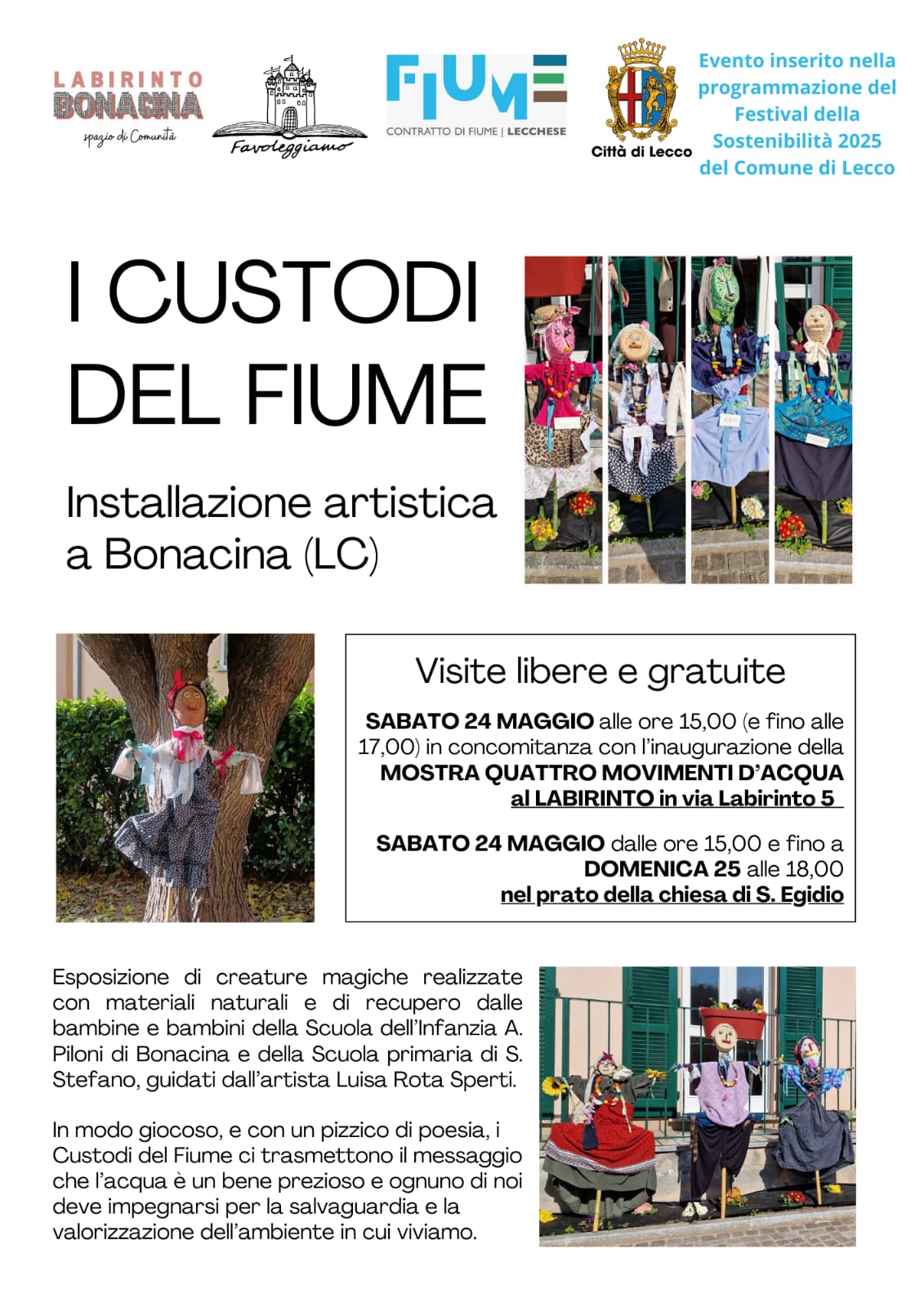 La mostra gratuita, realizzata con la collaborazione dell’artista Luisa Rota Sperti, si inserisce all’interno del Festival della Sostenibilità 2025 promosso dal Comune di Lecco. Il progetto nasce da un’esperienza laboratoriale che ha coinvolto i bambini della Scuola A. Piloni di Lecco in un percorso creativo, naturale e simbolico. Custodire il torrente Caldone ha rappresentato un modo concreto per educare alla sostenibilità ambientale e al rispetto della natura fin dalla prima infanzia.
