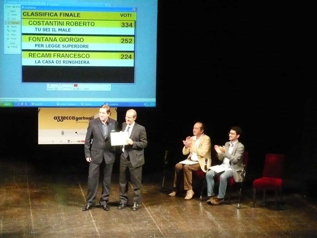 LECCO – “Tu sei il male” di Roberto Costantini è il vincitore con ben 334 voti dell’edizione 2012 del Premio Azzeccagarbugli al Romanzo Poliziesco, appuntamento che da otto anni si rivolge a tutti gli appassionati di thriller e letture noir. Promosso come sempre dalla Provincia di Lecco e dal Gruppo Giovani Imprenditori di Confindustria Lecco, il premio ha avuto la sua serata conclusiva ieri, quando sul palco del Teatro della Società sono saliti i tre finalisti, precedentemente selezionati dalla Giuria di Letterati (composta dalla presidente e scrittrice Margherita Oggero, dai giornalisti Luigi Bolognini, Luigi Mascheroni e Marta Perego e dalla scrittrice Rosa Mogliasso).
