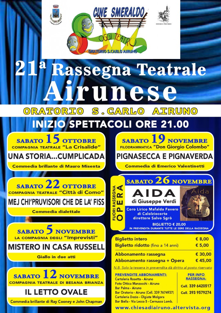 AIRUNO – Come ogni anno, sabato 15 ottobre inizierà la tanto attesa rassegna teatrale di Airuno che proprio quest’anno festeggerà il suo 21 anniversario.