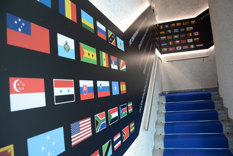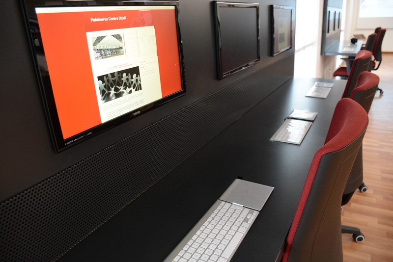 Le bandiere dei diversi Stati, 206 in tutto, accompagnano il visitatore verso l’ingresso del sala dove saranno raccolte ed esposte 196 carte costituzionali dal mondo, un materiale consultabile anche in formato elettronico attraverso le postazioni informatiche installate all’interno del locale, ma anche attraverso il web collegandosi al sito www.palatauruscentrostudi.eu.