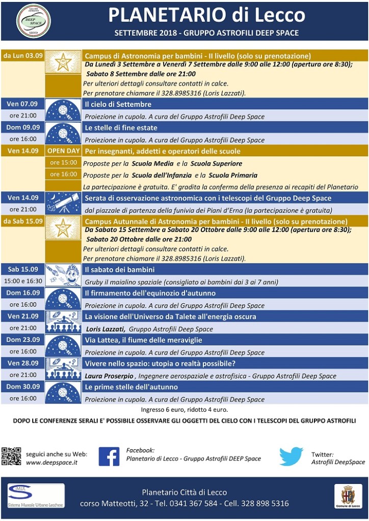 Venerdì 14 settembre è in programma l’open day, rivolto agli insegnanti e operatori delle scuole e pensato per illustrare loro le proposte didattiche per la scuola media e superiore alle 15 e dell’infanzia e primaria alle 16. la partecipazione è gratuita, con conferma della presenza ai recapiti del Planetario. Sempre venerdì alle 21 si terrà una serata di osservazione astronomica con i telescopi dal piazzale di partenza della funivia dei Piani d’Erna, la partecipazione è gratuita.
