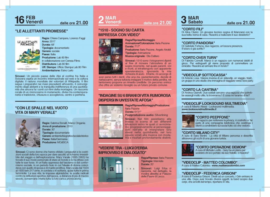Ad aprire la terza edizione, venerdì 16 febbraio, “Le allettanti promesse”, realizzato da Chiara Campara e Lorenzo Faggi. Si tratta del docufilm girato dai due autori in occasione del raduno mondiale dei volontari di Wikipedia ad Esino Lario lo scorso anno. Vincitore fra l’altro al Festival dei Popoli.