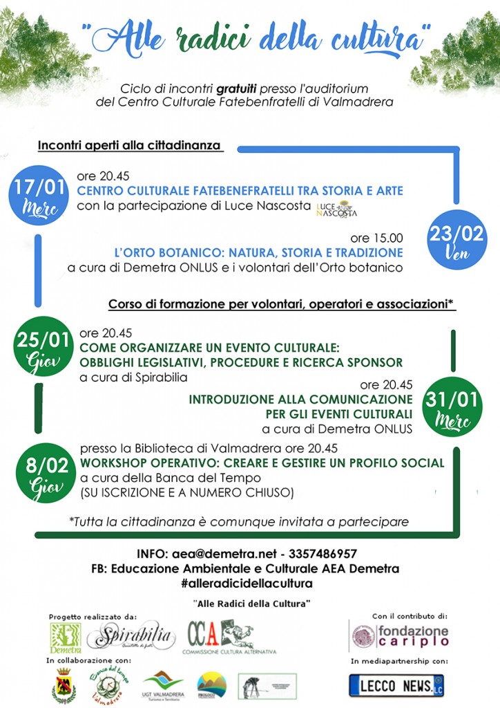 VAMADRERA – Il Settore Educazione Ambientale e Culturale di Demetra ONLUS e l’assessorato alla Cultura del Comune di Valmadrera sono lieti di annunciare venerdì 23/02 l’incontro gratuito e aperto dal titolo “L’ORTO BOTANICO: NATURA STORIA E TRADIZIONE”, alle ore 15.00 presso l’Auditorium del Centro Culturale Fatebenefratelli di Valmadrera, con gli operatori di Demetra ONLUS e i volontari del vicino Orto botanico, all’interno del progetto “Alle Radici della Cultura” realizzato grazie al contributo di Fondazione Cariplo.