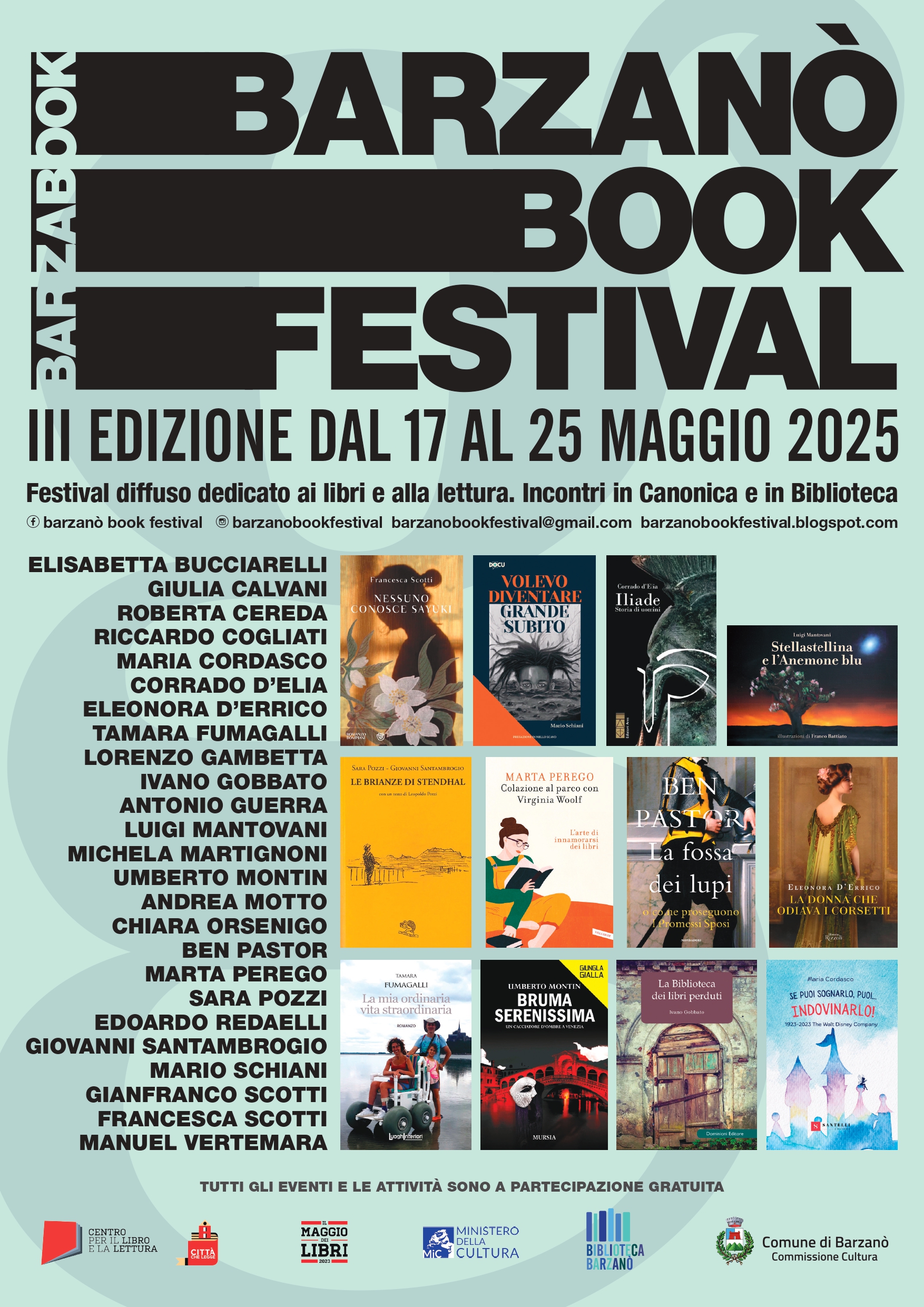 BARZANO’ – Anche il Comune di Barzanò partecipa all’iniziativa nazionale “Il maggio dei libri” e organizza la terza edizione di “Barzanò Book Festival“: una settimana di inziative, dal 18 al 25 Maggio, dedicate al libro, alla lettura e alla narrazione diffuse sul territorio comununale. Le varie iniziative coinvolgono diverse realtà locali con eventi mirati e pensati su misura per ogni utenza.