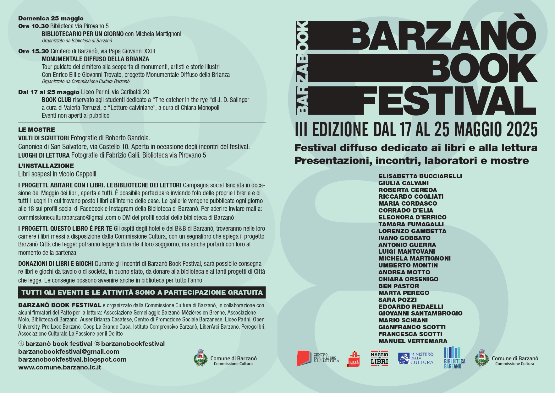 Infine il Maggio del libri e la terza edizione di Barzanò Book Festival, terranno a battesimo un ulteriore nuovo progetto proposto dalla Commissione Cultura: “Questo libro è per te“. Volumi nuovi di ogni argomento, saranno consegnati alle strutture alberghiere e ai B&B di Barzanò, per essere lasciati a disposizione degli ospiti, che potranno così scoprire nuovi autori e spunti di lettura, e portarli anche con loro al momento della ripartenza.