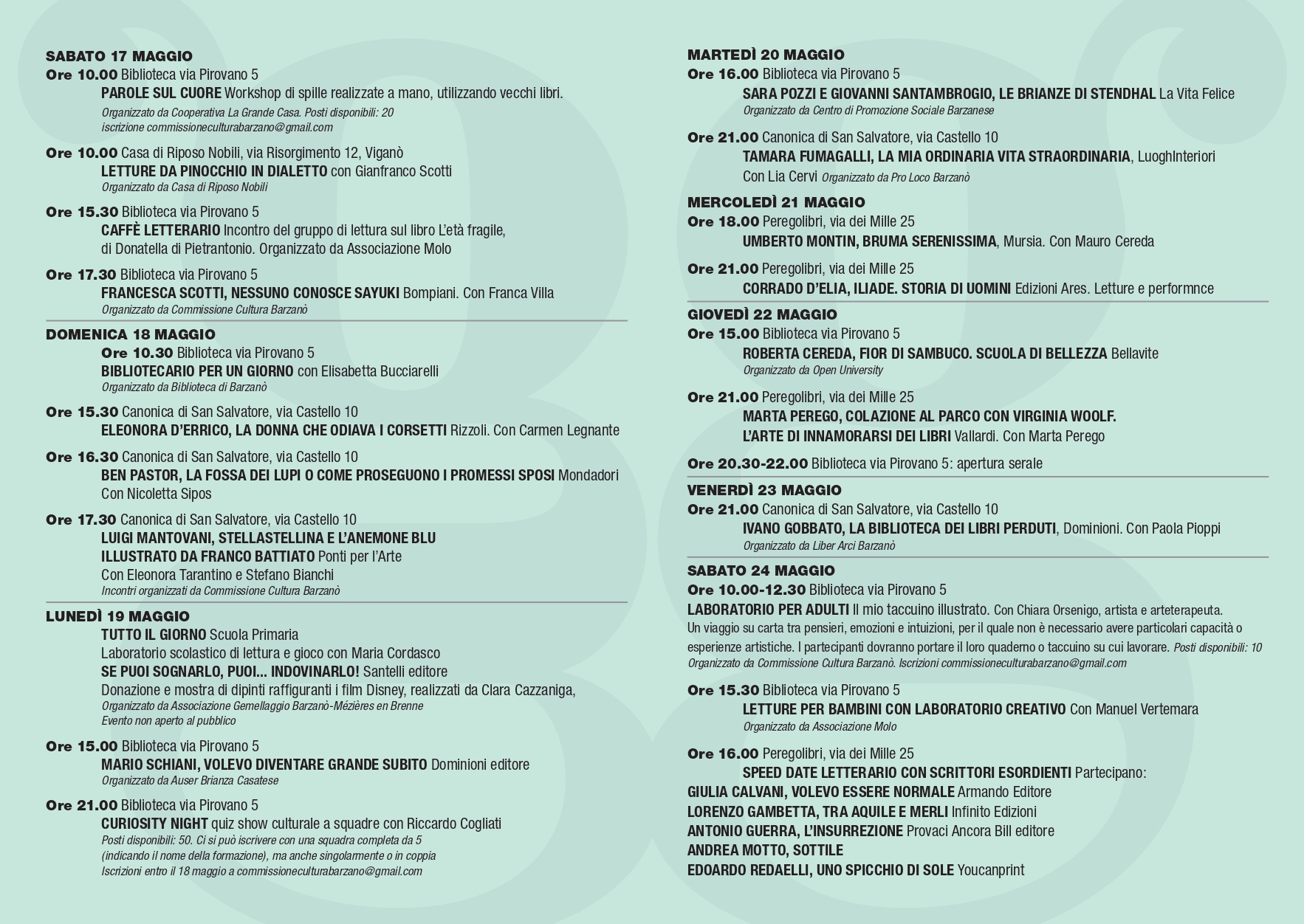 Il programma si articola in una trentina di eventi, diversificati e finalizzati a coinvolgere persone delle più svariate provenienze, età, formazioni, coinvolte in un unico momento di interesse per la lettura e il racconto. Il festival propone infatti attività che coinvolgono i libri e la lettura in molte e svariate declinazioni, come ad esempio con la Curiosity Night di Riccardo Cogliati, il quiz show culturale a squadre in programma per Lunedì 19 oppure il workshop di spille realizzate a mano usando vecchi libri previsto per Sabato 17. Per il programma completo degli eventi si rimanda alle locandine a questi link.